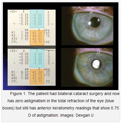 虽然我们的角膜曲率计仅能测量角膜前表面曲率,但还有其它一些设备(诸如角膜地形图)在白内障术前能准确测量角膜后表面曲率。另外,术中像差仪能在混浊晶体取出后,IOL植入前的无晶体状态提供角膜散光度数。