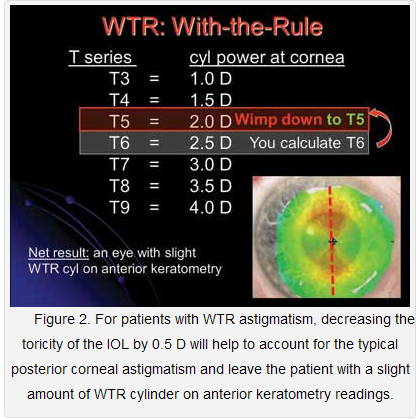 在做toric IOL计算时,如果用标准角膜曲率计测量的角膜散光为2.5D顺规散光,我们应该清楚需要治疗的散光要比测得的度数少0.5D,因此,我们从计算的T6 IOL(2.5 D of toricity)降低到T5 IOL(2D of toricity)。我们应该记住,对于顺规散光,应降低一个级阶(Figure 2)。