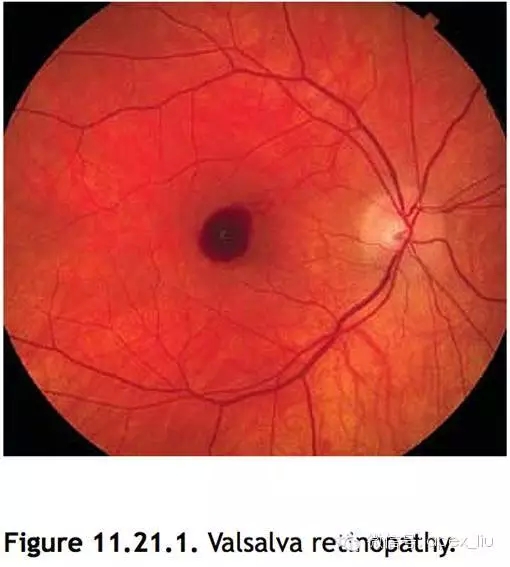 Valsava动作使眼内静脉压的突然升高,造成黄斑区浅表的毛细血管破裂。可与抗凝治疗有关。
