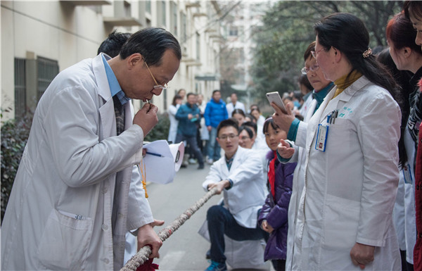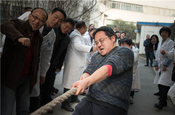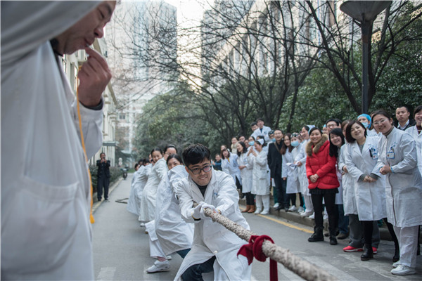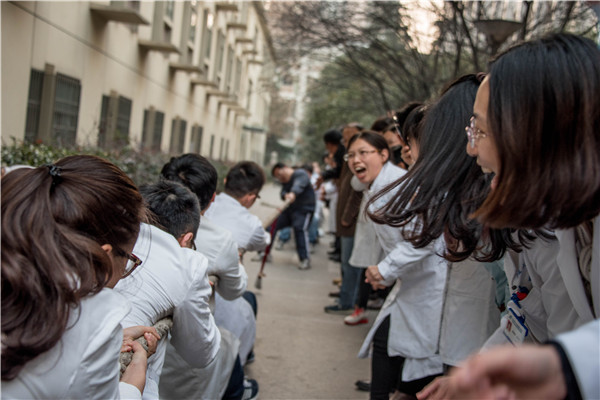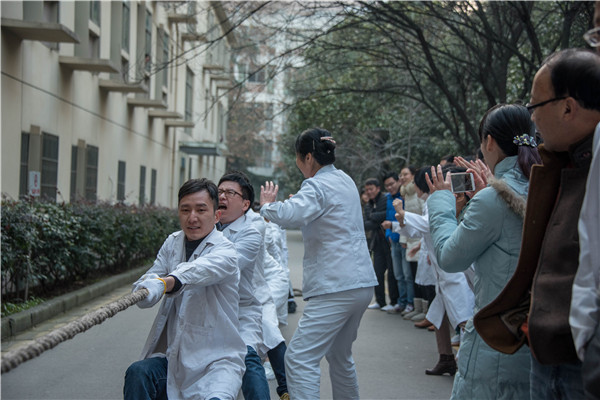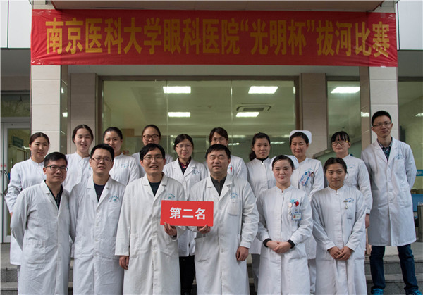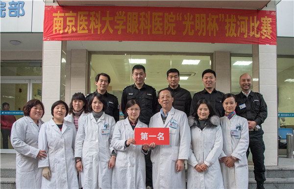 2016年12月30日下午16:30,南京医科大学眼科医院一年一度迎新年拨河比赛在住院部前举行,参赛的8支代表队,早已磨摩拳擦掌,剑拔弩张,人人斗志昂扬,志在必得。随着裁判哨声一声令下,顿时,呼喊声、加油声震耳如雷,队队斯杀面红耳赤。