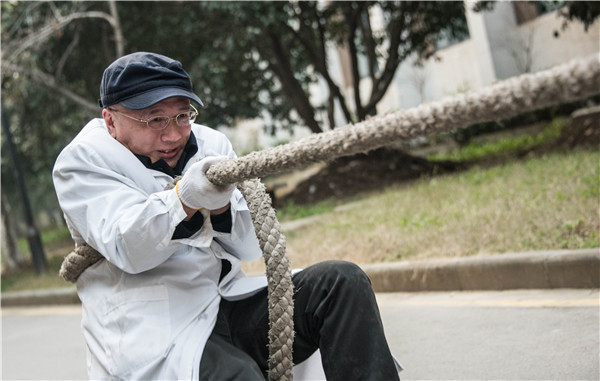 精彩的是半决赛,一四病区联队与配镜中心队,两队实力几乎不分上下,比赛中,挂在中间的红线铁锤在中线一动不动,红绳僵持一分多钟!经过数分钟艰苦对峙,一四病区联队获胜。