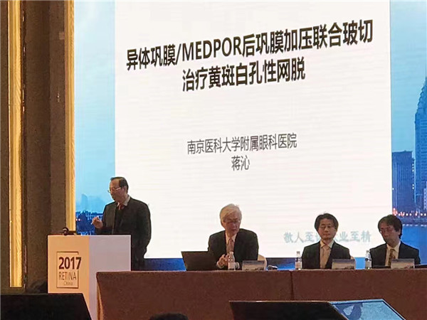 蒋沁教授在会中就“Posteriorscleral buckling with allogeneicsclera and MEDPOR combined with vitrectomy fortreatment of Macular Hole RetinalDetachment with staphyloma(异体巩膜/MEDPOR后巩膜加压联合玻切治疗黄斑白孔性网脱)”这一题目与国外专家展开探讨交流:黄斑白孔性视网膜脱离由于血供差,组织生长愈合困难及巩膜薄、眼轴长等因素,既往采用常规玻璃体切割手术治疗往往难以愈合、易复发或有硅油依赖可能;蒋沁教授通过大量基础研究发现,眼科常用的植入材料MEDPOR具有良好的血管化和组织相容性,在分析和结合MEDPOR与异体巩膜的优缺点后,首创了既利于手术操作,又利于减少损伤的“三明治式”加压块,完美实现了“刚柔并济”;联合适宜的加压方式及手术技巧,可以提高手术的成功率。这种创新的玻切联合异体巩膜/ MEDPOR后巩膜加压术,临床观察与单纯玻切组相比术后网膜复位率明显增加。同时,蒋沁教授还展示了精彩的手术视频,得到了众多专家的赞扬及肯定。蒋沁教授的本次交流内容,是我国视网膜研究的新进展与成果的代表,充分展示了国内眼科专家的手术技巧与水平。