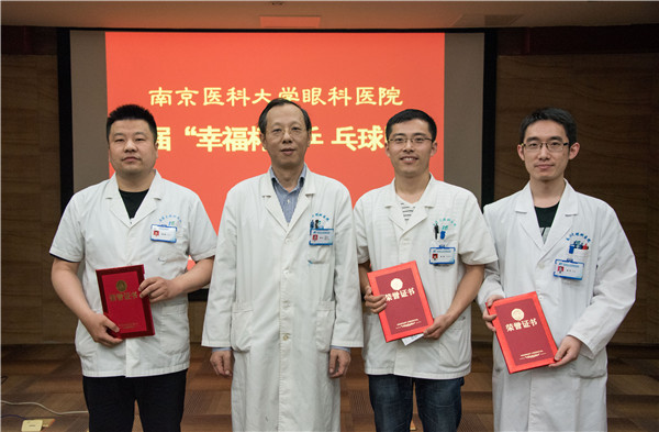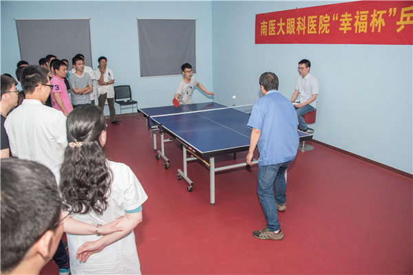 南京医科大学附属眼科医院于首届“幸福杯”乒乓球比赛于6月2日晚开赛,经过预赛和决赛,决出团体名次分别为:名:行政职能科室 、 第二名:三病区 、 第三名:门诊 。通过过比赛丰富了职工的业余文化生活、激化了职工团结拚博的精神。