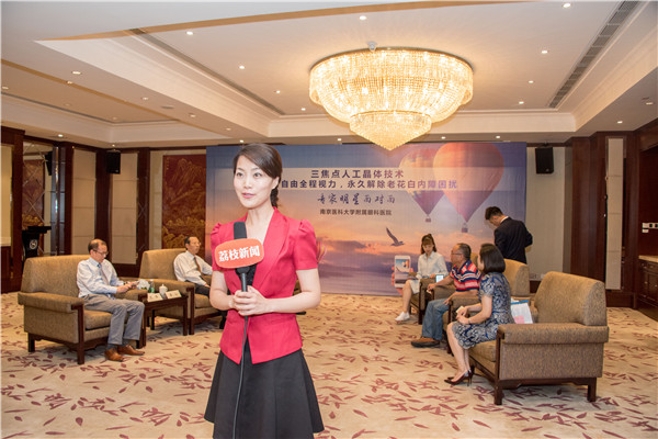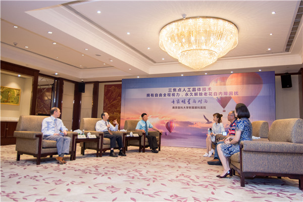 当天,还举行了“‘拥有自由全程视力,永久解除老花白内障困扰’专家—明星面对面” 活动。特邀南京著名电视台主持人老吴、代晓乐、韩莹与蒋沁教授、沈晔教授、朱思泉教授,共话三焦点人工晶体植入术。三位明星主持人结合自己用眼问题,向专家就三焦点人工晶体植入术,治疗白内障、近视、老花的原理、安全性、手术时间及如何爱眼护眼进行了提问,三位专家都给予了细致解答。