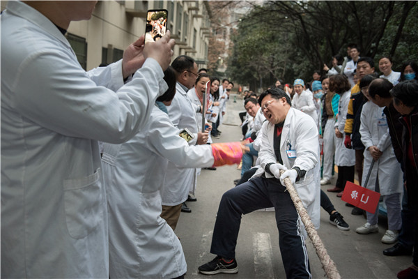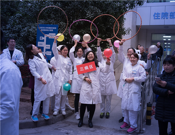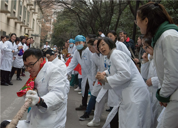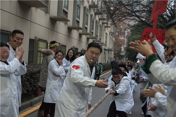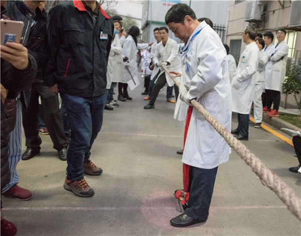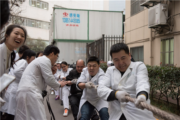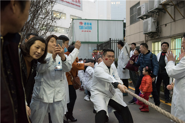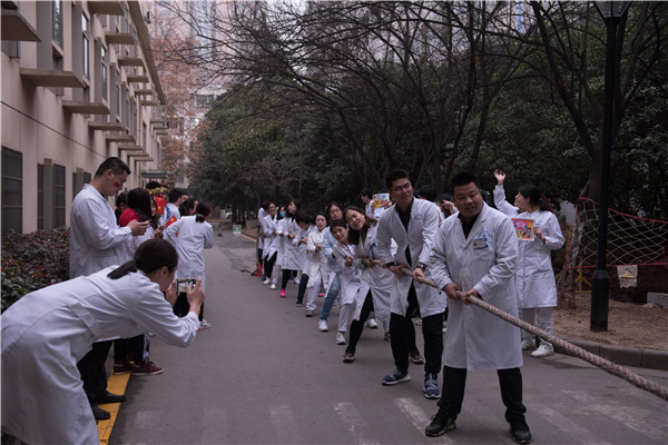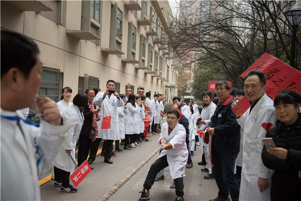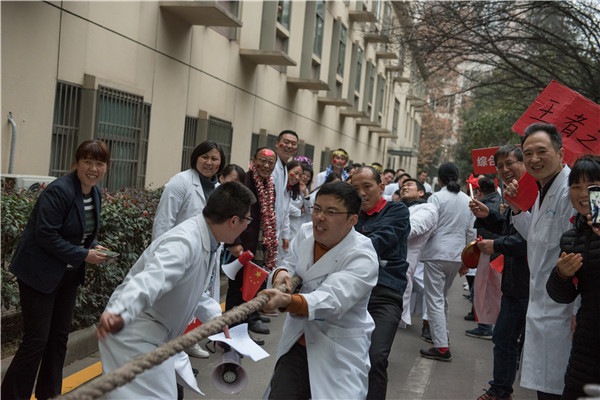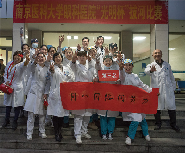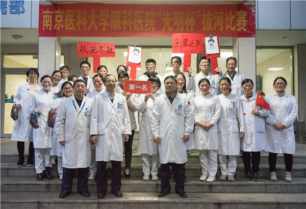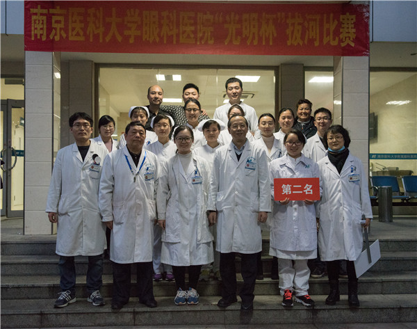 2017年12月29日下午,南京医科大学附属眼科医院住院部大楼前,加油声、欢呼声、笑语声彼此彼伏,眼科医院2018迎新春拨河比赛在这里举行,南医眼科人以特殊的方式--拨河比赛方式,辞别2017,喜迎2018年!