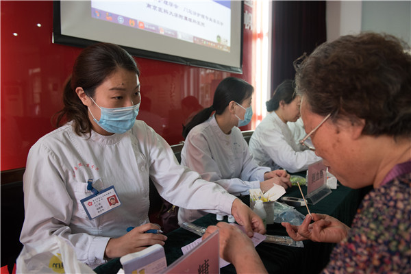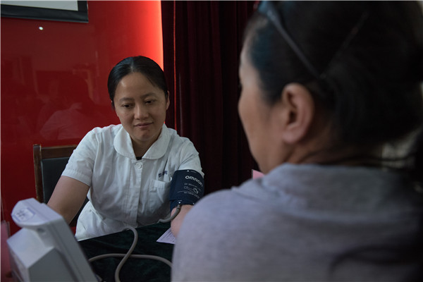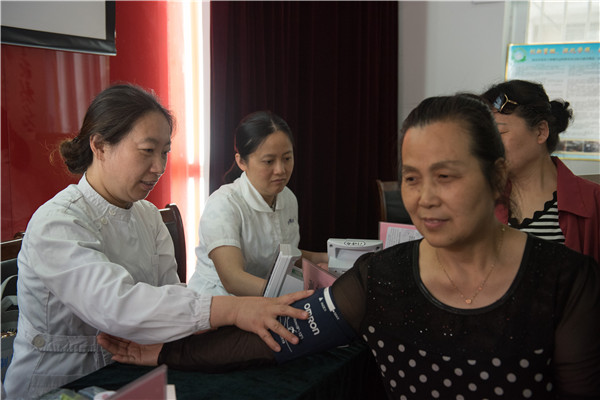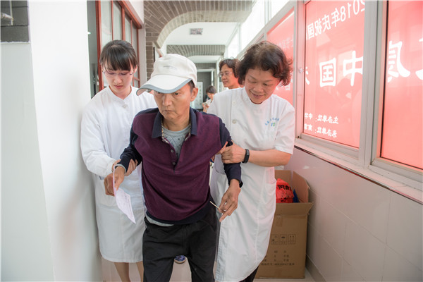 专业医护人员用带来的仪器和设备,认真地为每一位老年人进行检查,且对患者的病情进行了耐心询问和细致检查。