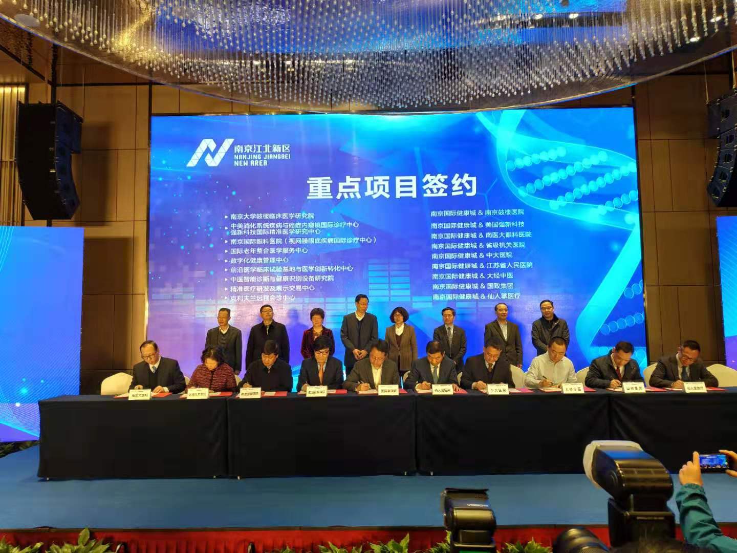 2019年3月1日上午,在南京瑞斯丽酒店举行了江北新区打造“三中心一高地”产业地标重大项目集中签约仪式,南京市委副书记、市长蓝绍敏,南京市委常委罗群等市领导和专家出席,南京医科大学校长沈洪兵、副校长鲁翔也出席了本次签约会,南京医科大学附属眼科医院蒋沁院长作为签约方代表受邀参加本次签约仪式。