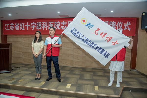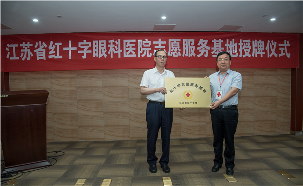 6月5日下午,由江苏省红十会授予的“江苏省红十字眼科医院志愿服务基地”授牌仪式,在南京医科大学附属眼科医院举行。江苏省红十字会徐国林副会长为“志愿服务基地”授牌,省红十字会组织宣传部部长江建宁宣读《关于同意在南京医科大学附属眼科医院建立红十字志愿服务基地的复函》,江苏省文明办志愿者工作处副处长祝筱炜为“博士志愿服务队”授旗,南京医科大学眼科医院蒋沁院长致词。省红十字会组织宣传部张燕副部长、南京医科大学第四临床医学院邵海亚院长、南医大眼科医院于志平副院长、曹国凡副院长及红十字志愿服务者60多人参加了授牌仪式。授牌仪式上志愿者代表进行了宣誓,授牌仪式由曹国凡副院长主持。