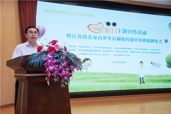 6月6日全国爱眼日,依托南京医科大学而成立的“江苏省儿童青少年近视防控研究中心”揭牌仪式,在南京市金陵汇文学校隆重举行,江苏省教育厅副巡视员李金泉、江苏省卫生健康委员会副主任周明浩、南京医科大学党委书记王长青到会致辞,并与江苏省市场监督管理局副局长冯新南一同为“江苏儿童青少年近视防控研究中心”揭牌。江苏省广播电视总台生活广播部副主任杨阳、南京市教育局副巡视员卢普新、江苏省疾病预防控制中心纪检委书记周永林、鼓楼区教育局副局长周斌、南京医科大学附属眼科医院院长蒋沁,以及省体育局、财政厅、人社厅、市场监管局、新闻出版局、广播电视局、健康江苏研究院领导及近视防控专家、爱眼志愿者、学校部分师生300多人出席揭牌仪式。揭牌仪式由江苏省教育厅体卫艺处张鲤鲤处长主持并宣读《省教育厅关于同意成立江苏省儿童 青少年近视防控研究中心的批复》。