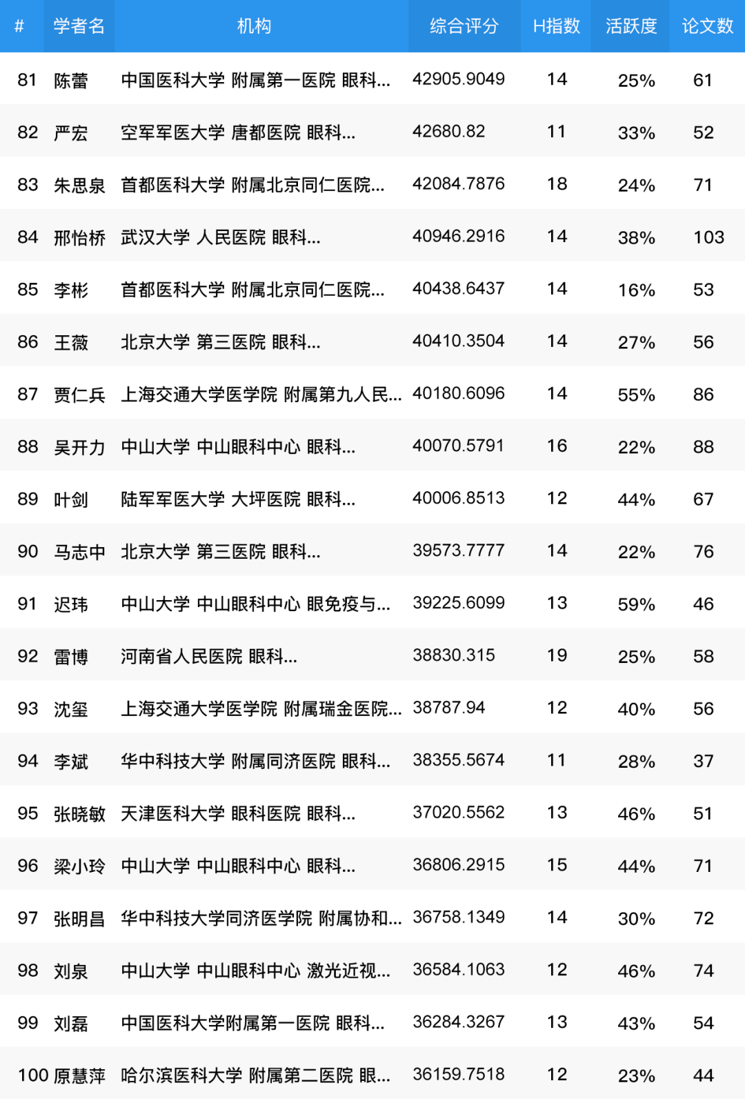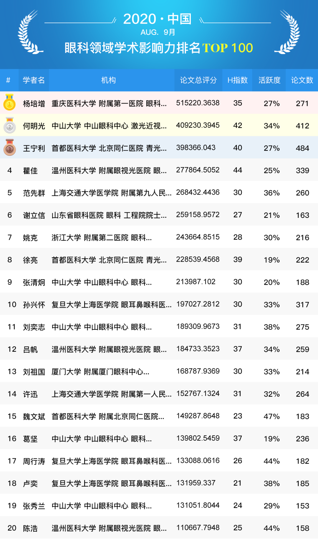 本排名是基于"全球学者库"的海量论文数据,针对眼科领域,广泛采集中国学者在海外发表的相关论文,建立基于论文的学者学术影响力评价方法、指标体系和数学模型,然后计算每位学者每篇论文的得分,将其全部论文累加获得每位学者的总积分,按总积分由高到低排序得到百强排名。