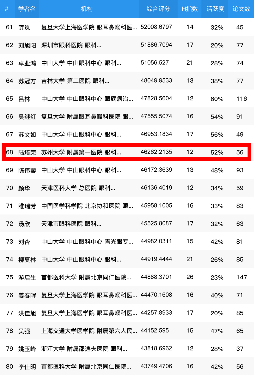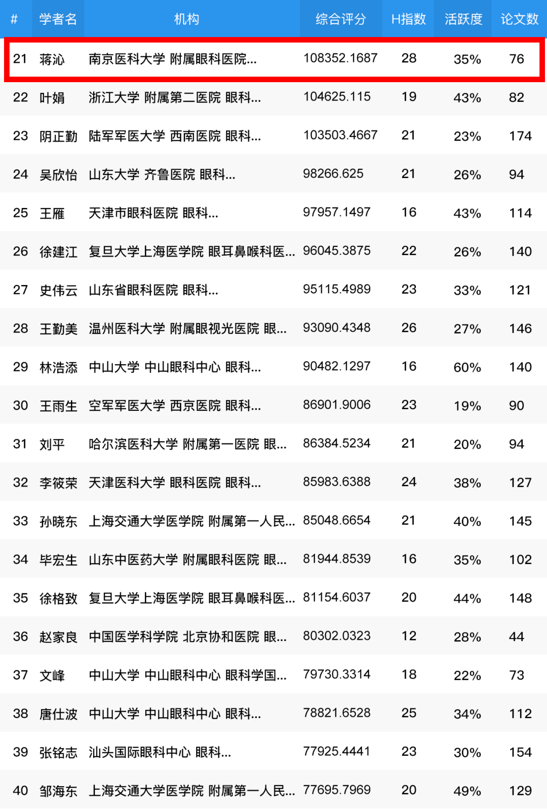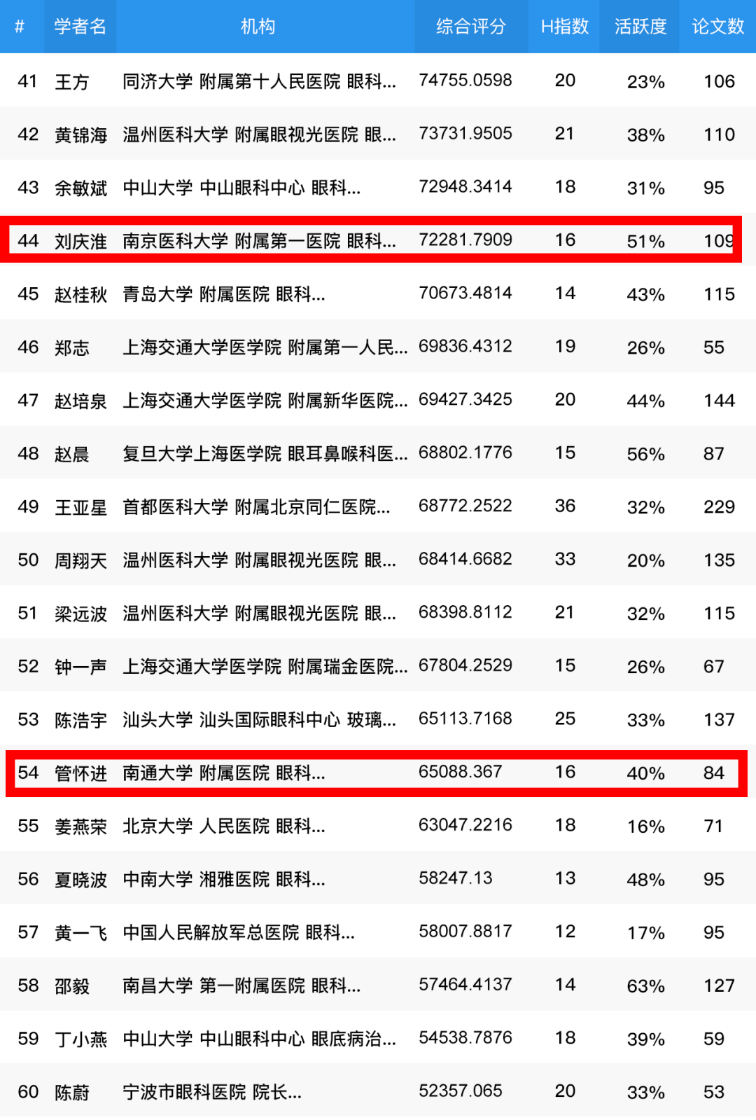 近日, 全球学者库发布全国眼科专家学术影响力百强排名,江苏省共有4位眼科专家进入榜单,其中包括南京医科大学附属眼科医院蒋沁教授、南京医科大学附属医院刘庆淮教授、南通大学附属医院管怀进教授和苏州大学附属医院陆培荣教授。