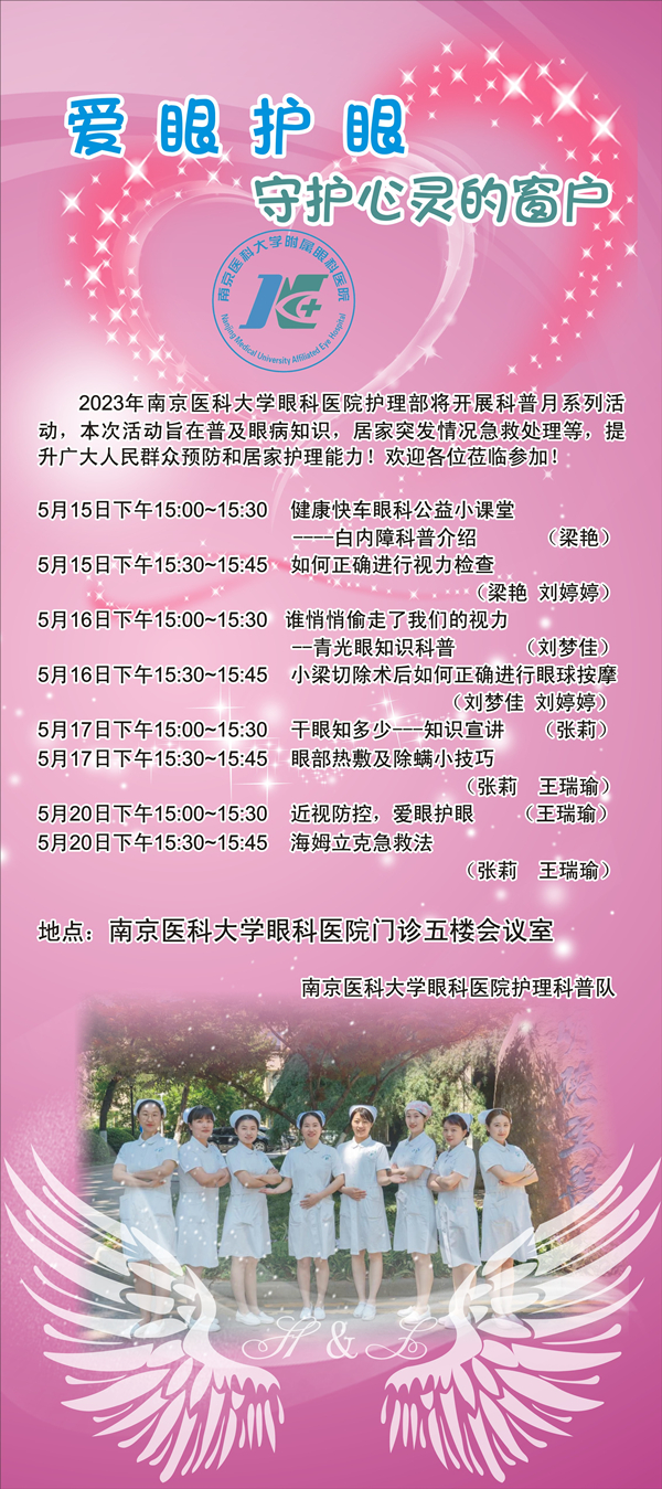 2023年5月份,为普及爱眼护眼知识,南京医科大学眼科医院护理部将开展科普月系列活动,本次活动旨在普及眼病知识,居家突发情况急救处理等,提升广大人民群众爱护视力、预急救处理和居家护理能力,欢迎各位莅临参加!