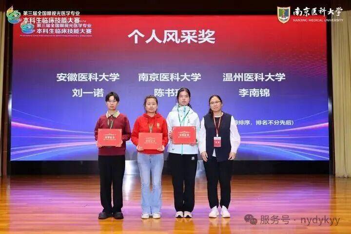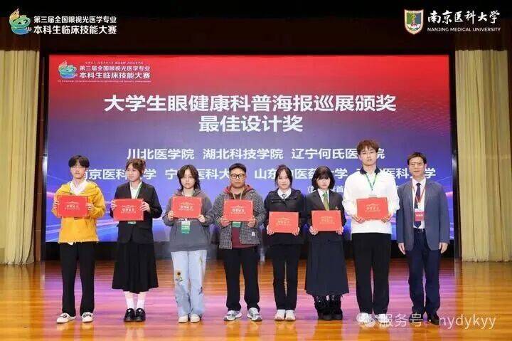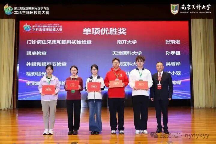 经过一天的激烈比拼,大赛产生金奖3个、银奖6个、铜奖12个,个人风采奖3个,单项优胜奖5个,大学生眼健康科普海报最佳设计奖7个、最佳创意奖7个、最佳传播奖7个。南京医科大学学生团队凭借出色的表现荣获金奖且总成绩排名第一,其团队成员在各项技能操作中展现出扎实的理论基础与娴熟的临床技巧,尤其在“外眼和眼前节检查”项目吴睿泽同学荣获单项优胜奖,陈书琪同学荣获个人风采奖。南京医科大学选送的作品-《干眼症大作战——当“绝症”遇上中医》在大学生眼健康科普海报巡展中荣获“最佳设计奖”。