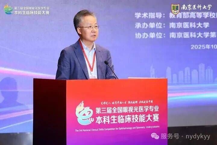 开幕式上,南京医科大学党委常委、副校长沈历宗向指导嘉宾、参赛院校师生表示热烈欢迎。他表示,南京医科大学自2016年招收眼视光医学专业学生以来,学校始终秉持“博学至精明德至善”的校训精神,深耕眼视光医学教育领域,致力于培养具有国际视野、创新精神和实践能力的卓越人才,并持续为社会输送高质量的眼视光医学人才。他强调,此次全国眼视光医学专业本科生临床技能大赛的举办,既是对各高校眼视光医学教学成果的集中检验,更是青年学子锤炼技能、激发潜能的重要契机。