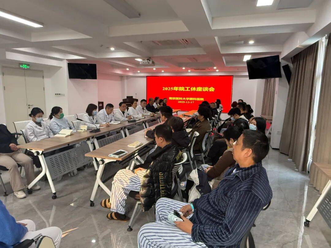 为深入践行“以患者为中心”的服务理念,搭建高效医患沟通桥梁,持续优化医疗服务质量,南京医科大学附属眼科医院院于2025年12月17日下午在门诊五楼会议室召开院工休座谈会。本次会议由护理部牵头组织,医务科、总务科、财务科、保卫科、营养科等各职能科室带头人及病区护士长悉数参会,三十余位住院患者及家属代表受邀出席,共同为医院发展建言献策。