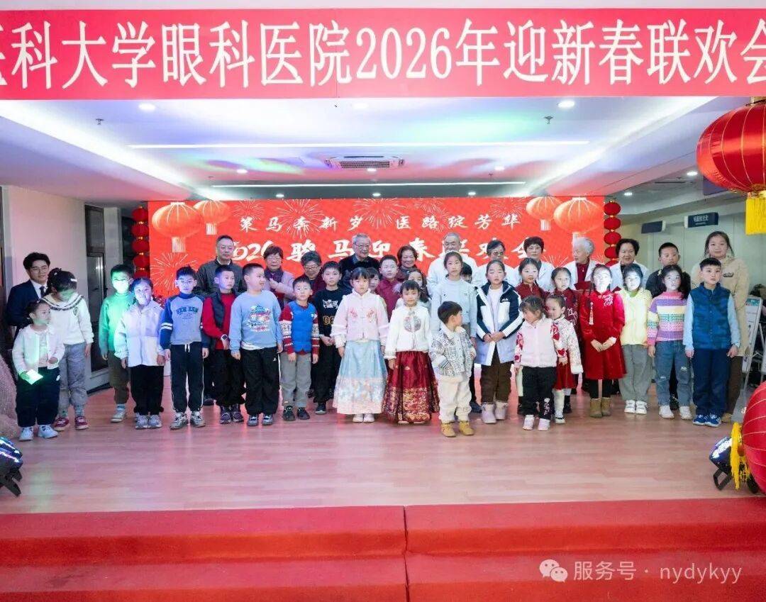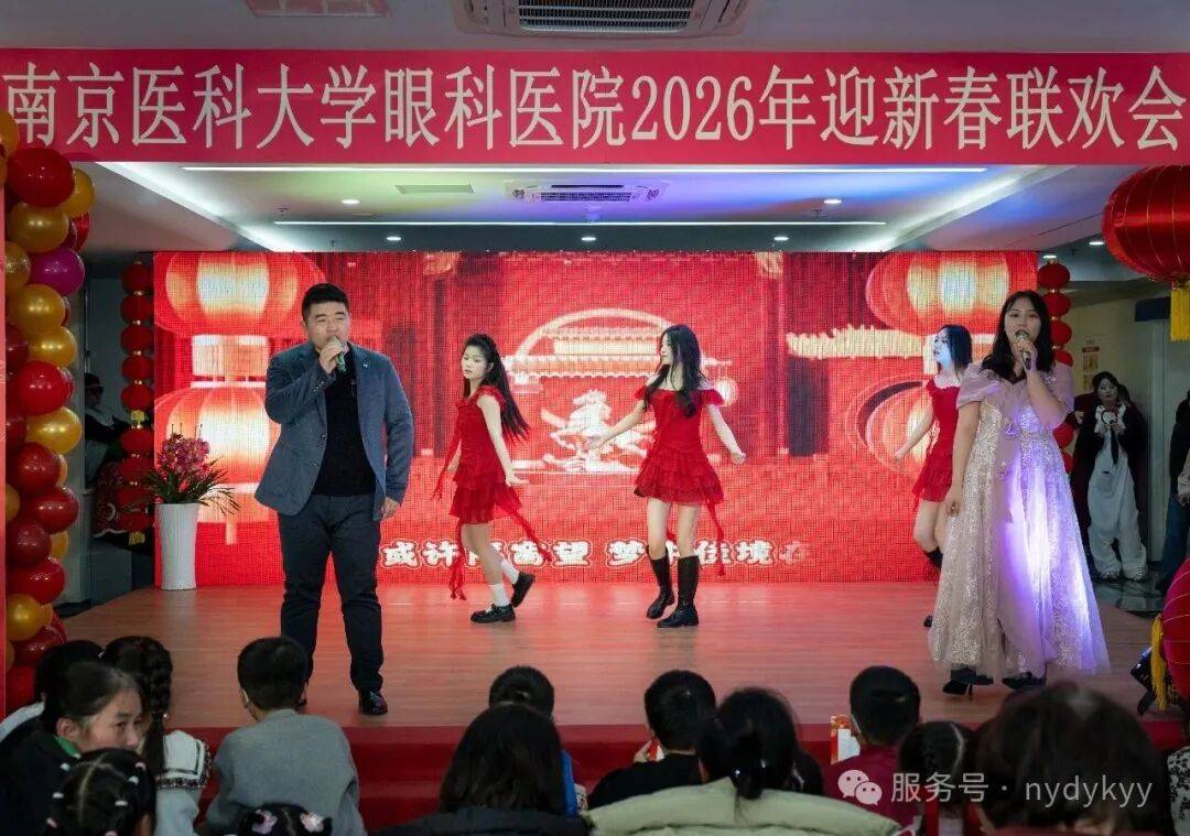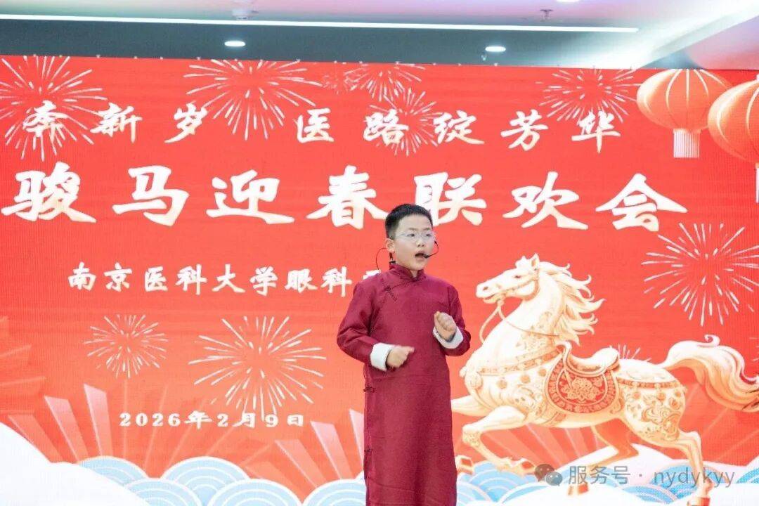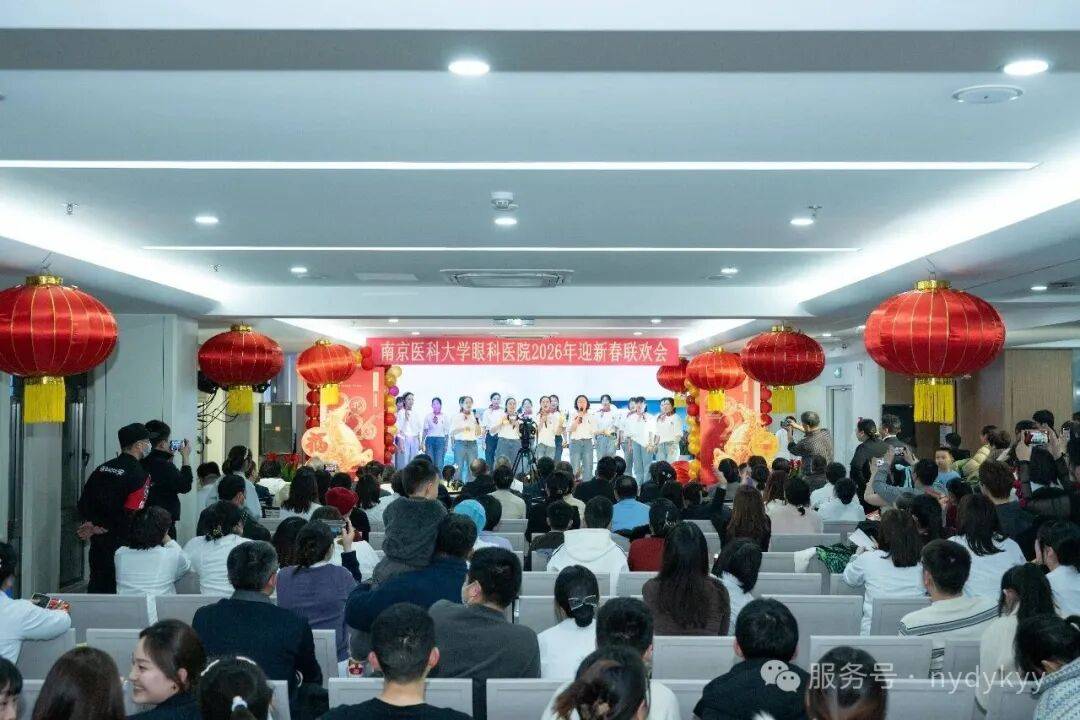 2月9日晚,南京医科大学眼科医院2026年“策马奔新岁,医路绽芳华”迎新春晚会,在门诊二楼大厅隆重举行。医院院长蒋沁、党总支书记、副院长姚进率全院领导班子成员,与干部职工及家属共300余人欢聚一堂,共迎马年新春。南京医科大学第四临床医学院党委书记陆铭、院长徐艳、党委副书记潘国华等领导也莅临晚会,院长徐艳讲话并向大家献上新年祝福,陆铭书记登台献上精彩表演。