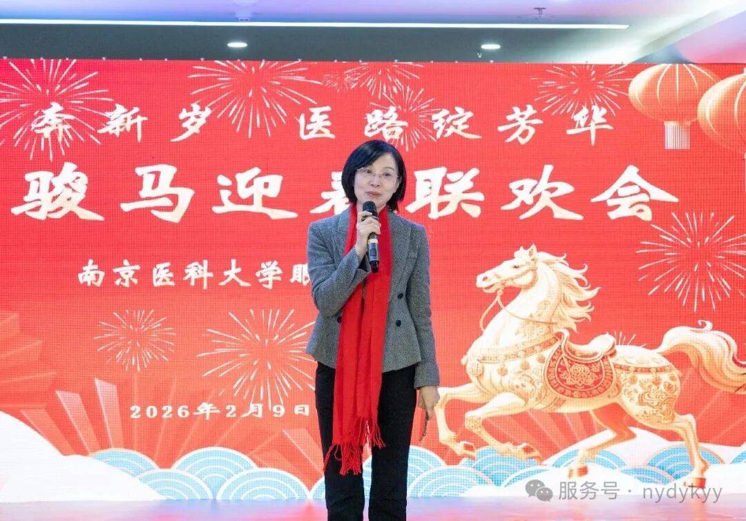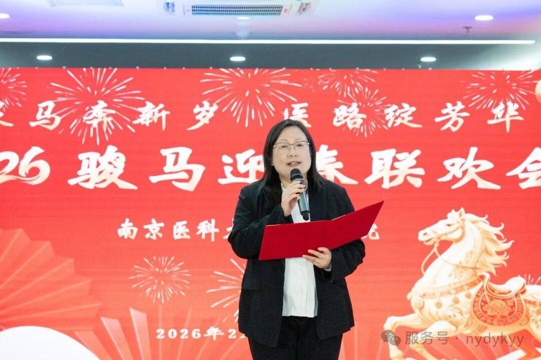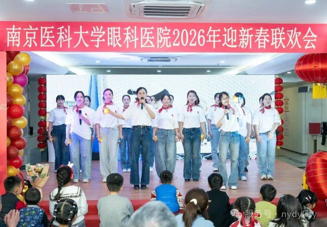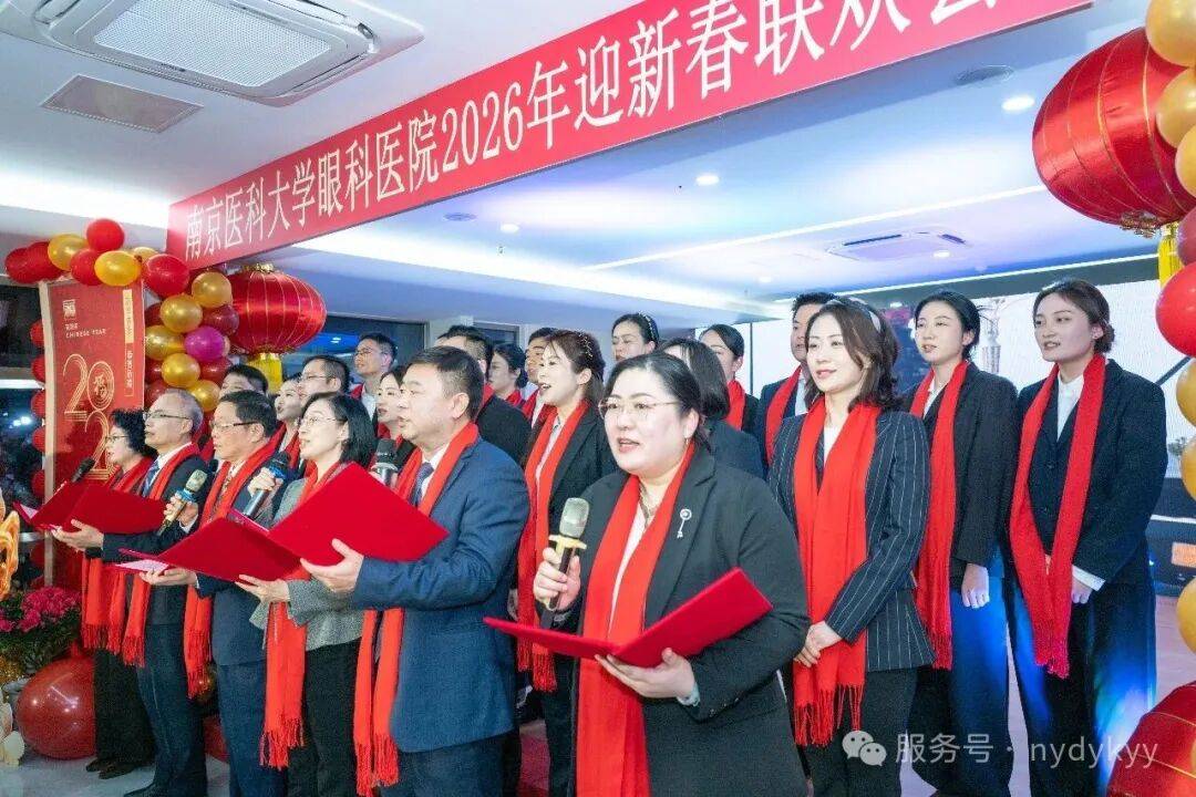2月9日晚,南京医科大学眼科医院2026年“策马奔新岁,医路绽芳华”迎新春晚会,在门诊二楼大厅隆重举行。医院院长蒋沁、党总支书记、副院长姚进率全院领导班子成员,与干部职工及家属共300余人欢聚一堂,共迎马年新春。南京医科大学第四临床医学院党委书记陆铭、院长徐艳、党委副书记潘国华等领导也莅临晚会,院长徐艳讲话并向大家献上新年祝福,陆铭书记登台献上精彩表演。