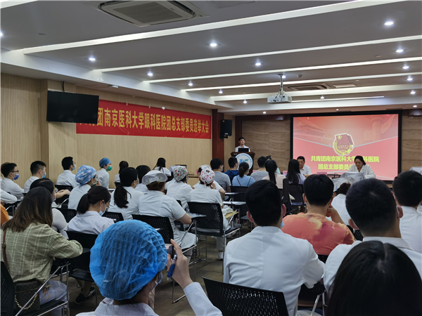 南京医科大学眼科医院于志平副院长、鼓楼区卫健委团委詹璟书记、南京医科大学眼科医院党支部纪委商卫红书记和鼓楼区各兄弟团支部团干部、本院团员代表共计80余人参加会议。会议由南京医科大学眼科医院党支部施晓康主任主持。